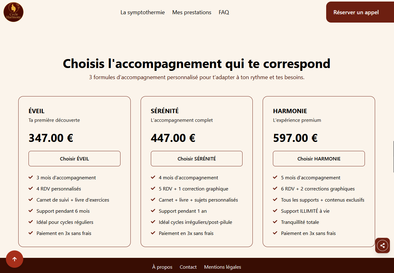TerminéCycleHarmony est un site web vitrine pour une auto-entrepreneuse experte en symptothermie. Le site présente ce qu'est la symptothermie, les différents packs de service et un formulaire de contact pour prise de rendez-vous.
